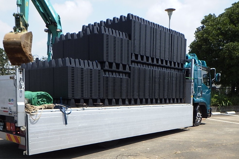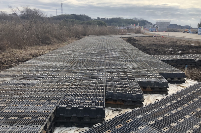「プラロード工法」は、軟弱地盤上に仮設道路を敷設する際、路盤をプラスチックユニットで形成する工法です。従来工法より簡単、スピーディーに仮設道路の敷設撤去が可能です。弊社は広大なプラロード資材センターを鹿嶋に保有しており、全国に向けリース展開しております。