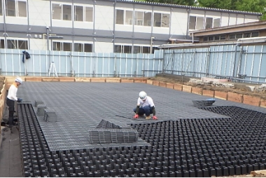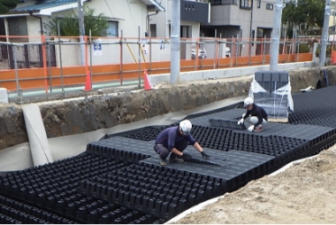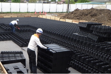 当社では、長年の実績を基に短時間で安価に設置できるプラスチック製の雨水貯留槽システムの設計、施工を行っています。設計は無料で行っておりますのでお気軽に声をおかけ下さい。