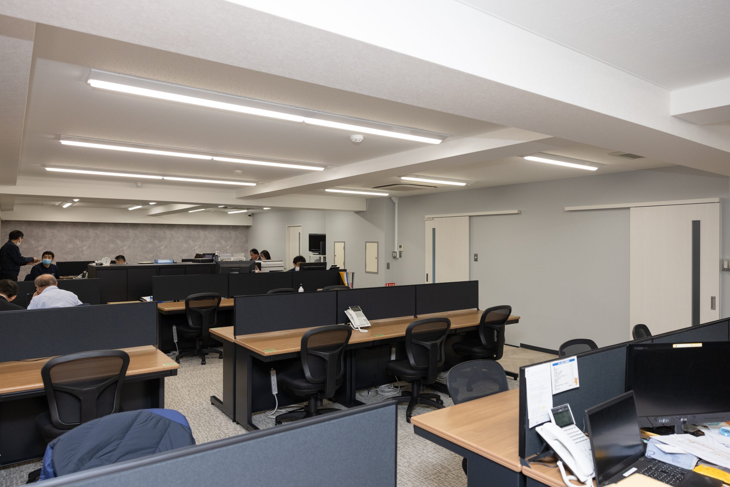 昨年末から今月中旬にかけて、事務所のレイアウトを一新しました 昭和の雰囲気が残る事務所を、30年以上ぶりに大改装しました。全面の壁クロスの貼替、床のOAフロア化、タイルカーペットや塩ビタイルの張替え、社長室と応接室の新設、建具の交換、受付のグリーン化、そして什器類の総入れ替えを行い、大幅にイメージアップを図りました。若手社員が増え、モチベーションアップを念頭に置いています。新しい環境で心機一転、頑張っていきましょう!